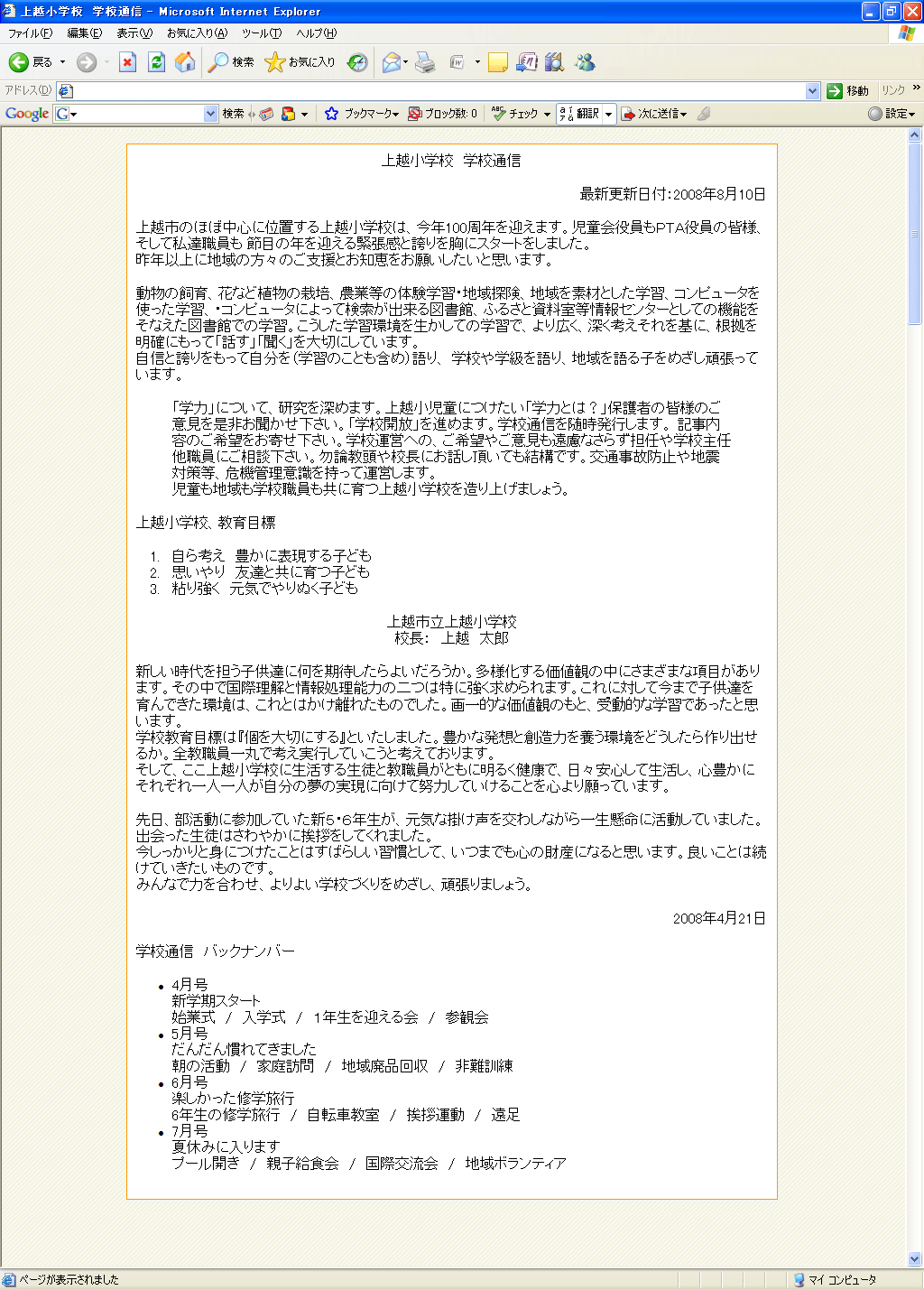 「上越市立上越小学校 校長: 上越 太郎」の上の行
